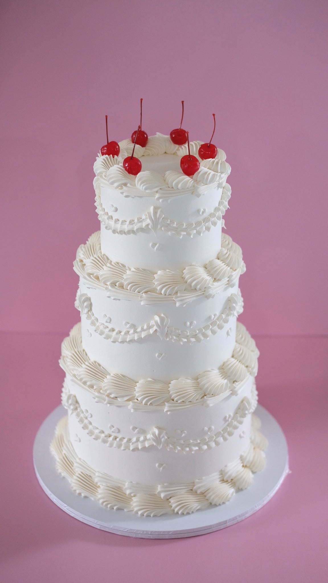 Each of the three tiers is luxuriously frosted in silky monochrome buttercream and adorned with delicate hand-piped mini hearts, intricate scalloped swirls, and signature vintage scrollwork. The design is finished with a playful touch of glossy maraschino cherries perched on top — a nod to classic retro patisserie style.