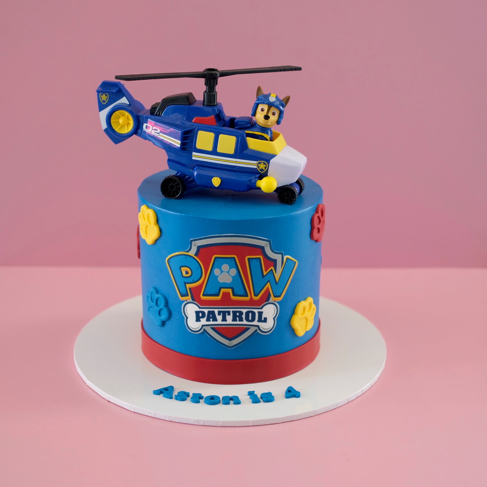 Sound the sirens—Chase’s Air Rescue Cake is flying in to save the day! Designed for Paw Patrol fans who admire the brave police pup, this cake features a vibrant blue buttercream base with colourful paw prints, a bold red trim, and the official Paw Patrol badge front and centre. Topped with Chase in his police helicopter, it’s a high-energy design that brings adventure straight to the party. Personalise it with your child’s name and age to complete the celebration!