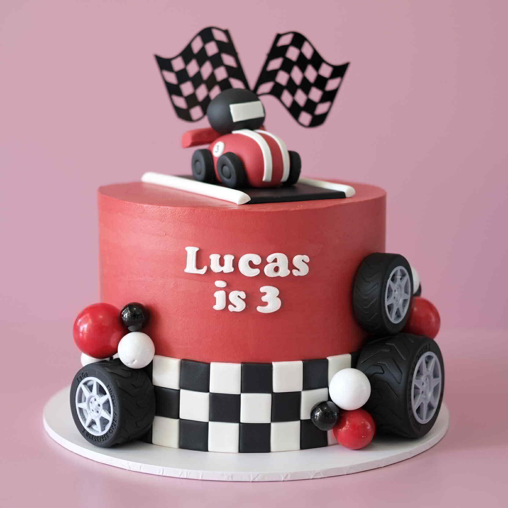 PRODUCT DESCRIPTION - Buttercream finished cake decorated with custom flag topper, fondant car, 3D printed race wheels, chocolate balloons & race stripes.